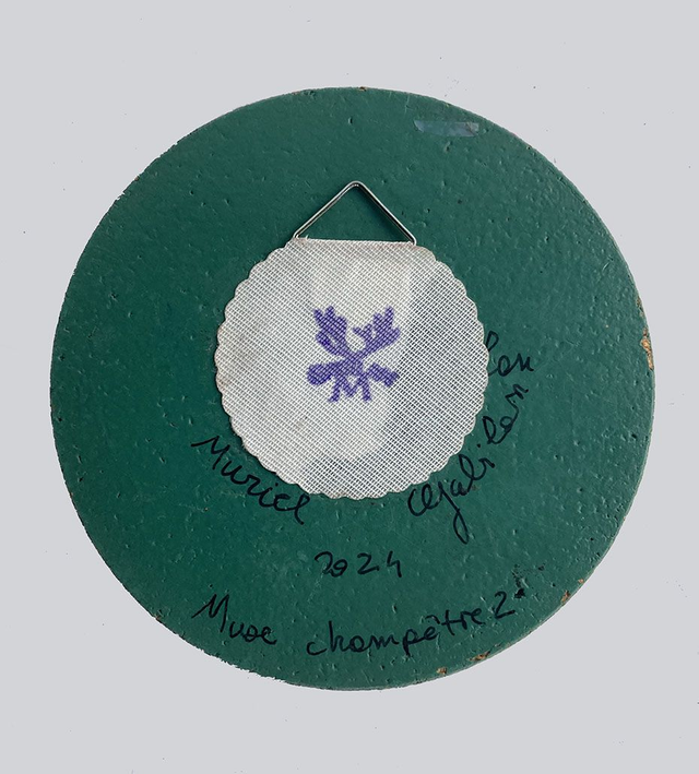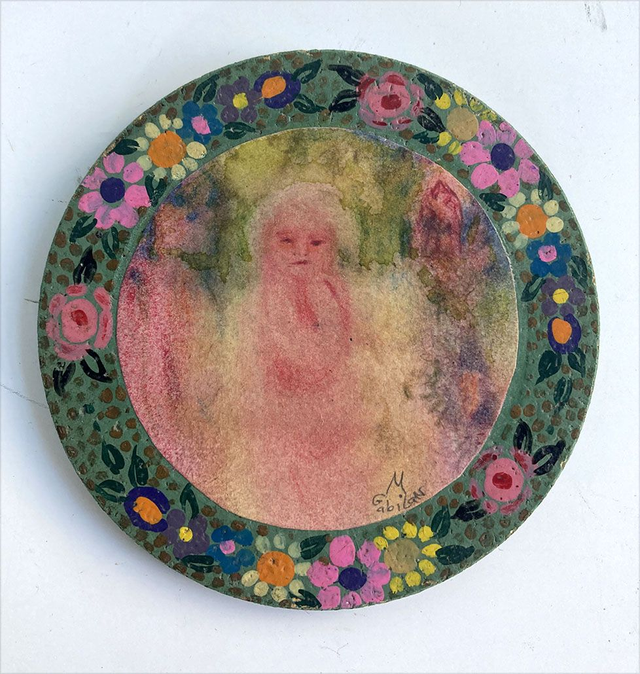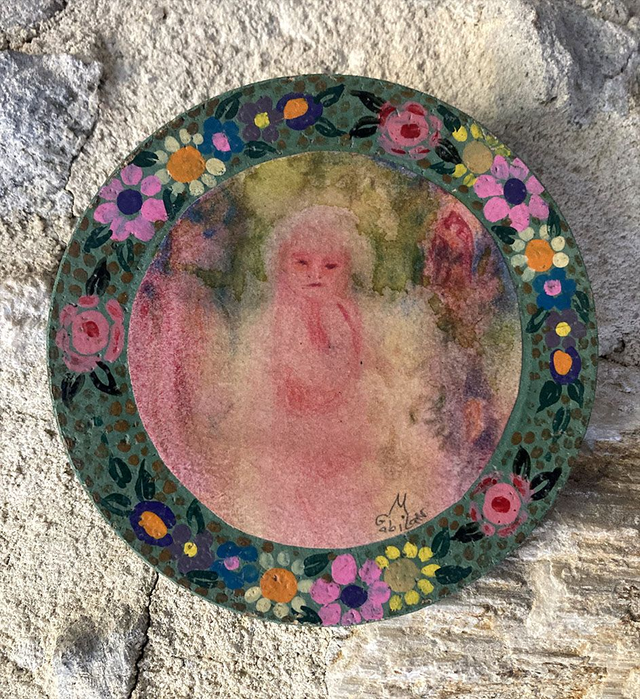 Ink and watercolor drawing on varnished and waxed paper, mounted on a round cork support painted green with a hand-painted floral border, ready to hang!